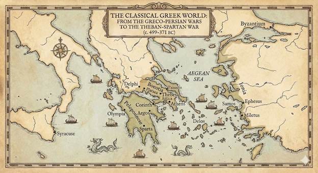 Sparta is campaigning actively against Persia in Asian Minor but must turn back due to bribery of mainland Greeks by the Persians. The Spartans had made good ground.