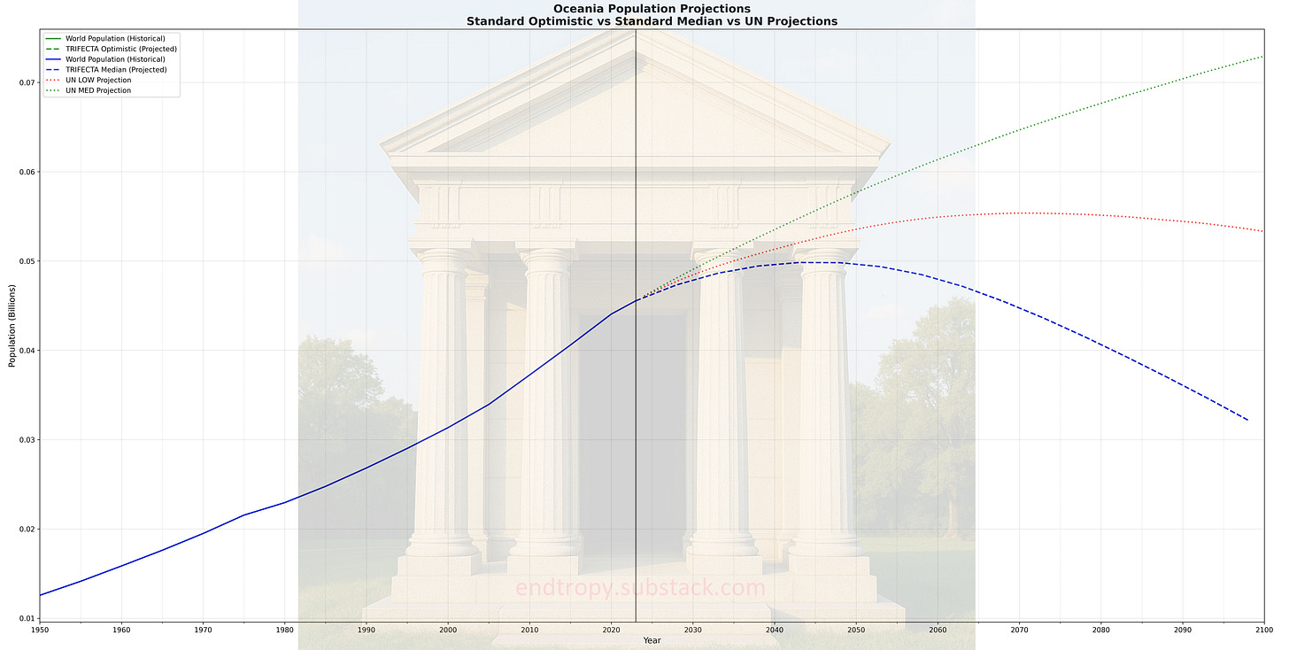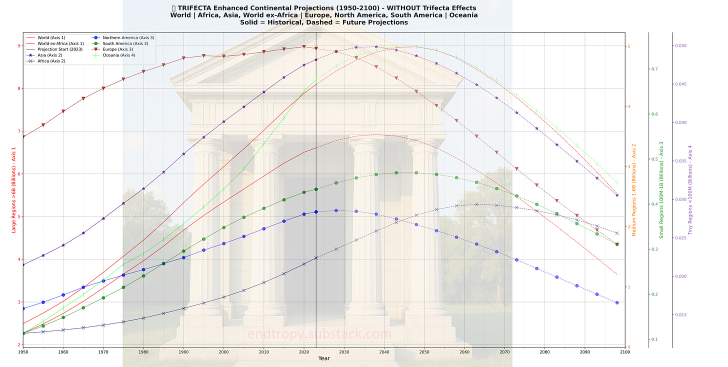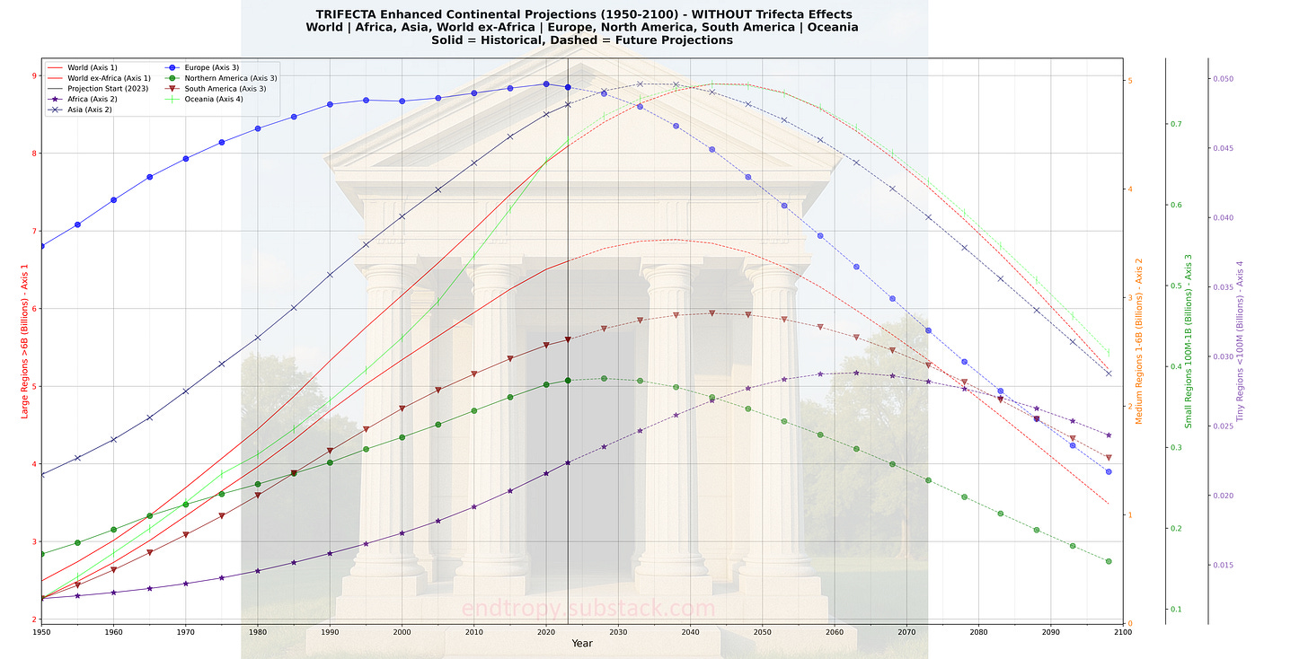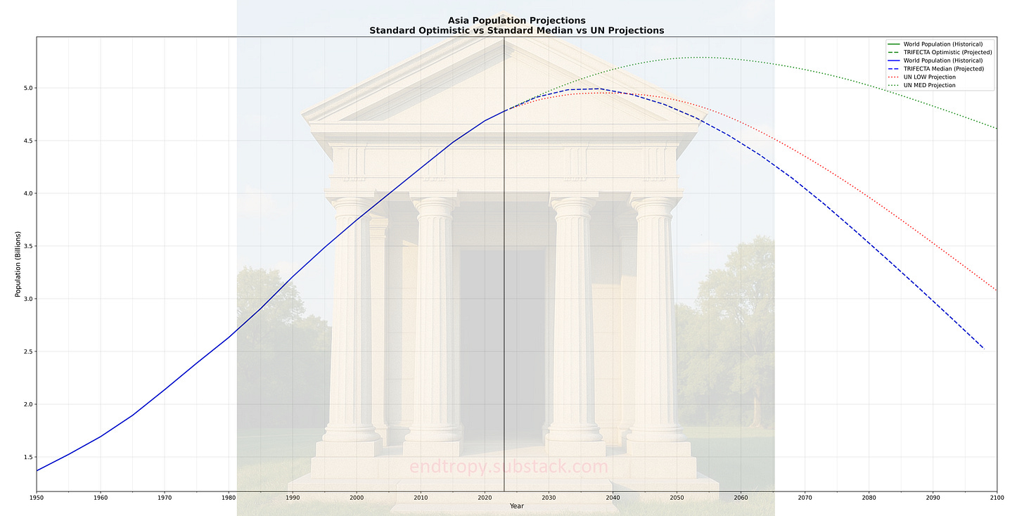 What if TFR trends do not rebound? What if they are simply stagnant? Nations at the 0.8 TFR FLOOR do not proceed below it. Nations with a declining TFR trend follow until they hit that same floor. We assume the East Asian economies won’t plunge even further into demographic decline. If any modeled countries decline and hit 0.8, they are also stopped from going any further.